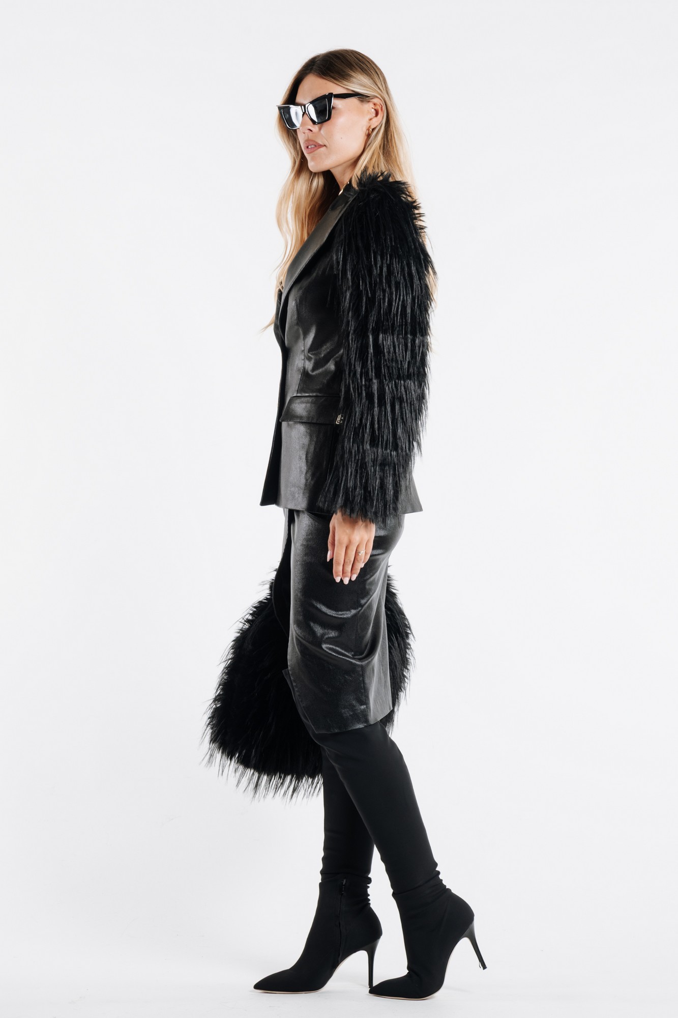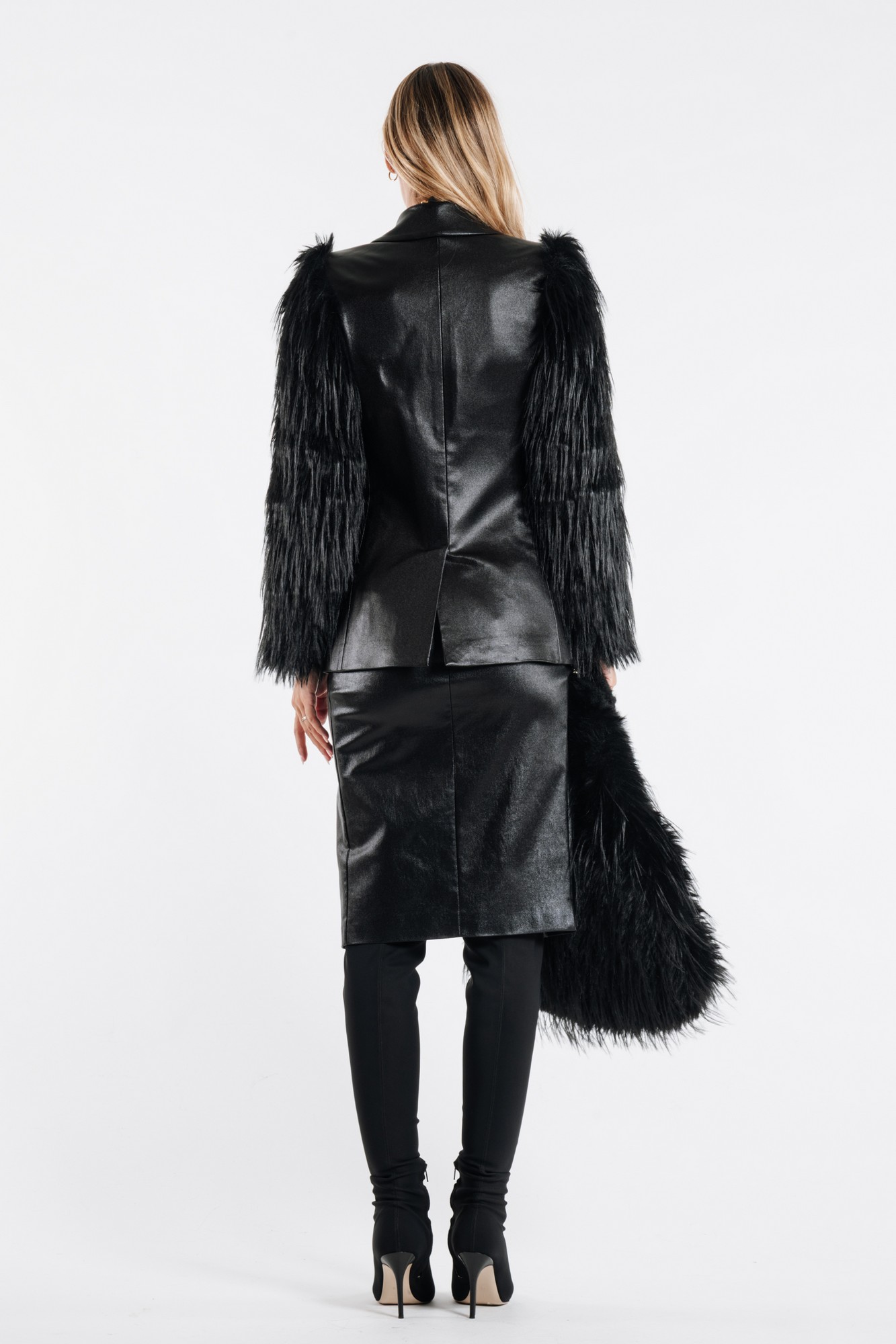 SINGLE-BREASTED COATED JACKET WITH ECO-FUR SLEEVES AND GOLDEN METAL BUTTONS