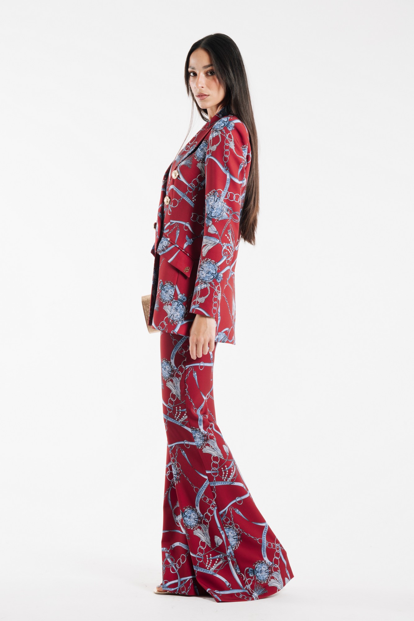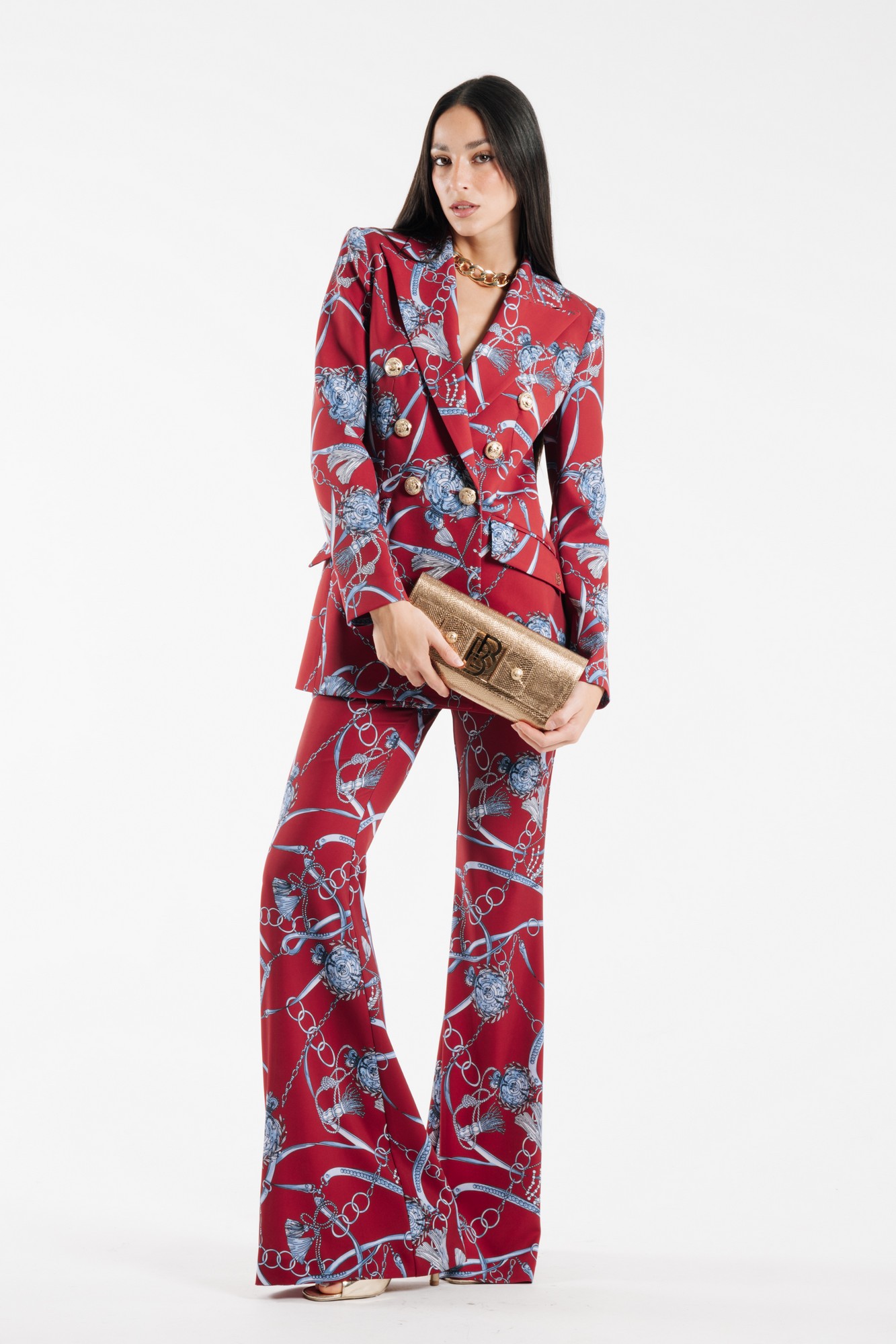 DOUBLE-BREASTED PRINTED BLAZER WITH PEAK LAPELS AND GOLD METALLIC BUTTONS